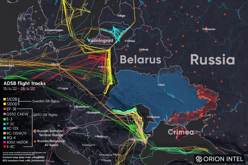 Additionally, as demonstrated in Figure 1.0, Ukraine almost certainly benefits from near-constant Intelligence, Surveillance, Target Acquisition, and Reconnaissance (ISTAR) support from allied force patrol aircraft operating along the Ukrainian and Belarussian border. These flights are likely monitoring the airspace above Ukraine, providing early warning to local air defences ahead of inbound air raids and missile strikes, as well as a probable ability to listen in on Russian communications in most of the theatre and detect Russia’s own mobile air defence systems.