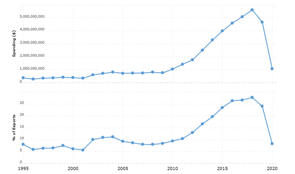 Over 250 people were killed in a string of Easter-related bombings in three churches and three hotels in Colombo in April 2019. Aside from the horrific loss of life and destruction of property, tourism – one of the main drivers of Sri Lanka’s GDP – immediately took a hit. Between 2018 and 2019, spending by international tourists decreased by 16.85%, and between 2019 and 2020, spending decreased by an extraordinary 76.92%. The below graph from MacroTrends shows very clearly that International Tourist spending – which in the 2010s was accounting for 20% of Sri Lankan exports – plummeted in 2019.