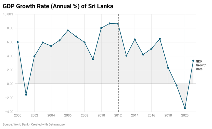 When Sri Lanka’s civil war came to an end in 2009, the country’s economy saw a substantial post-war boom. The economy started to show signs of life as the country’s infrastructure was renewed and security was strengthened. This boom, though, turned out be just temporary, and the growth could did not continue for more than three years. The graph below shows that by 2012, the GDP growth rate had dropped significantly, from over 8% to roughly 4% and never fully recovered to the highs of the early 2010s.